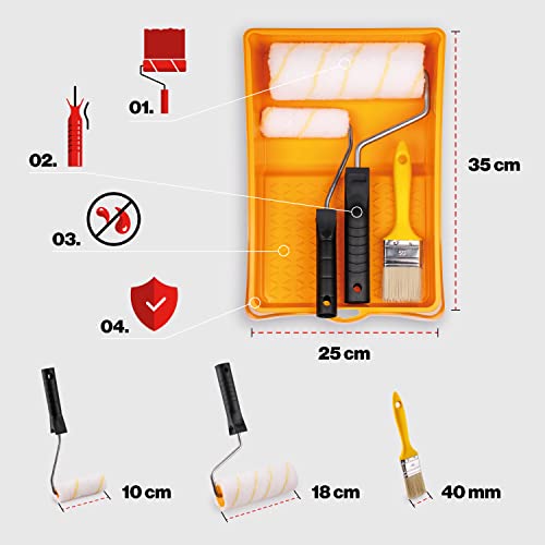 Leveringsomvang: 1x platte borstel 50 mm, 1x verfroller 10 mm met handvat, 1x verfroller 180 mm met handvat, 1x verfbak 26 cm x 33 cm